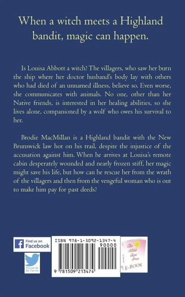 Is Louisa Abbott a witch? The villagers, who saw her burn the ship where her doctor husband’s body lay with others who had died of an unnamed illness, believe so. Even worse, she communicates with animals. No one, other than her Native friends, is interested in her healing abilities, so she lives alone, companioned by a wolf who owes his survival to her. Brodie MacMillan is a Highland bandit with the New Brunswick law hot on his trail, despite the injustice of the accusation against him. When he arrives at Louisa’s remote cabin desperately wounded and nearly frozen stiff, her magic might save his life, but how can he rescue her from the wrath of the villagers and then from the vengeful woman who is out to make him pay for past deeds?