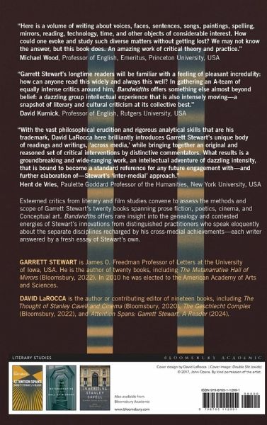 Distinguished literary and film theorists convene to engage with Garrett Stewart's twenty books of inter-medial analysis, shelved across several disciplines, in a collection of essays as multifaceted and resonant as Stewart's own writing. Critical luminaries from the fields of literary and film studies assess the methods and scope of Garrett Stewart's career-long work across the fields of literary history and poetics, cinema and media studies. The unprecedented scope of Stewart's interests also embraces certain lines of development in art history down through the so-called post-medium condition, including abstract as well as figurative painting, conceptual book sculpture-followed by an interactive e-text monograph on the place of time-based images in contemporary gallery installation. Through it all, under the rubric of what Stewart calls "narratography," there is a continual return to microplots of fictional phrasing, from Victorian novels to post-millennial American fiction. Given Stewart's steadily tuned ear for the play of vocal enunciation, his interests arc in this way from a performative phonetics of print text to a study of star-singing on screen. Assorted essays variously analyze directly, or extrapolate from, Stewart's evolving methodology: a "signature" analytic intensity tested in its yield on interpretive challenges from literary prose and art history through cinema theory and screen stardom. Bandwidths accompanies a companion volume, Attention Spans-Stewart's "autobiographical," or better, autophilosophical chronicle of method and evolution. Contributors to Bandwidthseither address Stewart's aims and achievements directly or build implicitly on them in fresh investigations of their own. Bandwidthsis a rare window into the genealogy, and contested energies, of interpretive endeavor, and offers interpretive and methodological interventions into fields ready to be reminded and recharged by Stewart's stalwart catalogue of indefatigable literary-critical and intermedial offerings.