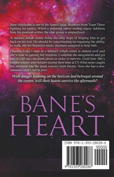 Bane Hardusho is one of the famed Jutak Warriors from Team Three fighting for justice. When a potential career ending injury sidelines him, his position within the elite group is jeopardized. A military rehab center holds the only hope of helping him to get back on his feet. He should be concentrating on regaining his ability to walk, not the beautiful medic assistant assigned to help him. Dharma Volgi's time at a military rehab center is almost over and she's close to gaining her freedom. Complete the assignment and get out. It's all she can think about in order to survive. Until him. She's helped soldier after soldier during their time at CV-8 but none caught her attention like the Jutak warrior from Enotia. Now she has a new mission—don't fall in love. With danger looming on the horizon and betrayal around the corner, will their hearts survive the aftermath?