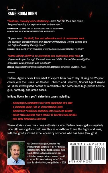 Federal Agents never know what to expect from day to day. During his 25 year career with the Bureau of Alcohol, Tobacco and Firearms, Special Agent Wayne M. Miller investigated dozens of remarkable and sometimes high-profile horrific gun, bombing, and arson cases. In Bang Boom Burn, a collection of 21 real-life stories, you'll delve into cases including: · Undercover assignments that turn dangerous on a dime · A suburban house full of stolen machine guns · Shocking bombings that killed and maimed police officers and others · Strange serial arson investigations plus several white collar arson-for-profit cases · And, some humorous situations These accounts show true crime enthusiasts what Federal investigators regularly face. All investigators could use this as a detailed textbook to see and feel the highs and lows, with the good and bad experienced by someone who has been through it. Agent Miller puts the reader up close and personal during interviews, crime scenes and in the courtroom. Anyone interested in true crime, investigative procedures, crime scene forensics, the inner workings of criminal conspiracies and fires, and trial proceedings will want to read this book. Many who read Miller's first book are clamoring for more of his in-depth chronicles
