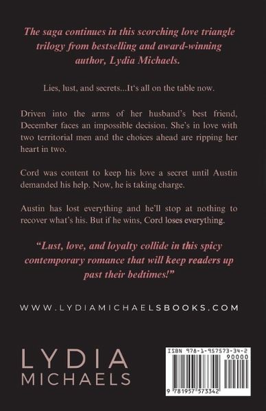 The saga continues in this twisted, dark love triangle from bestselling and award-winning author Lydia Michaels! Driven into the arms of her husband's possessive best friend, December faces an impossible choice and runs away. What happens when love shatters loyalty and trust becomes a gamble? Someone is bound to lose. December's marriage is unraveling, and the only person who can help is the one man who's loved her in secret for years-her husband's best friend, Cord. As tensions rise and emotions ignite, she's caught between two possessive, passionate men. With secrets surfacing and hearts on the line, December faces an impossible choice in this scorching, unflinching tale of lust, love, and loyalty.