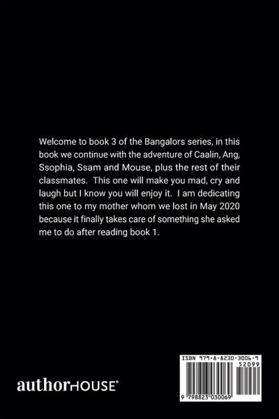 Welcome to book 3 of the Bangalors series, in this book we continue with the adventure of Caalin, Ang, Ssophia, Ssam and Mouse, plus the rest of their classmates. This one will make you mad, cry and laugh but I know you will enjoy it. I am dedicating this one to my mother whom we lost in May 2020 because it finally takes care of something she asked me to do after reading book 1.
