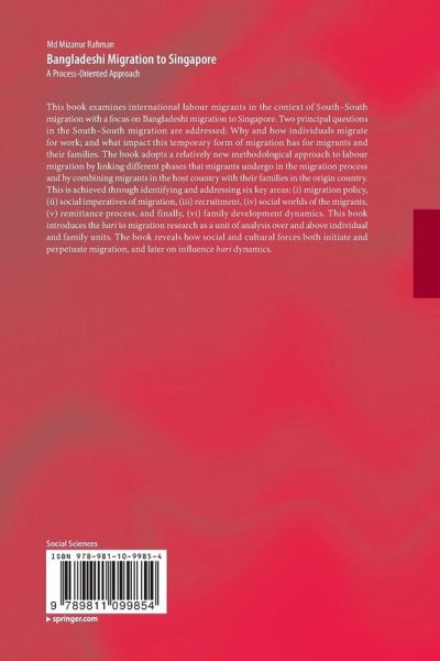 This book examines international labour migrants in the context of South-South migration with a focus on Bangladeshi migration to Singapore. Two principal questions in the South-South migration are addressed: Why and how individuals migrate for work; and what impact this temporary form of migration has for migrants and their families. The book adopts a relatively new methodological approach to labour migration by linking different phases that migrants undergo in the migration process and by combining migrants in the host country with their families in the origin country. This is achieved through identifying and addressing six key areas: (i) migration policy, (ii) social imperatives of migration (iii) recruitment, (iv) social worlds of the migrants, (v) remittance process, and finally, (vi) family development dynamics. This book introduces the bari to migration research as a unit of analysis over and above individual and family units. The book reveals how social and cultural forces both initiate and perpetuate migration, and later on influence bari dynamics.