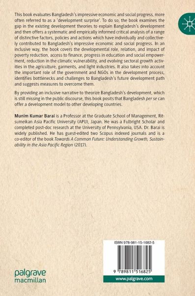 This book evaluates Bangladesh's impressive economic and social progress, more often referred to as a 'development surprise'. In doing so, the book examines the gap in existing explanations of Bangladesh's development and then offers an empirically informed analysis of a range of distinctive factors, policies, and actions that have individually and collectively contributed to the progress of Bangladesh. In an inclusive way, the book covers the developmental role, relation, and impact of poverty reduction, access to finance, progress in education and social empowerment, reduction in the climatic vulnerability, and evolving sectoral growth activities in the agriculture, garments, and light industries. It also takes into account the important role of the government and NGOs in the development process, identifies bottlenecks and challenges to Bangladesh's future development path and suggests measures to overcome them.