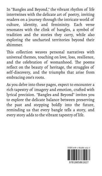 In "Bangles and Beyond," the vibrant rhythm of life intertwines with the delicate art of poetry, inviting readers on a journey through the intricate world of culture, identity, and femininity. Each verse resonates with the clink of bangles, a symbol of tradition and the stories they carry, while also exploring the uncharted territories beyond their shimmer. This collection weaves personal narratives with universal themes, touching on love, loss, resilience, and the celebration of womanhood. The poems reflect on the beauty of heritage, the struggles of self-discovery, and the triumphs that arise from embracing one's roots. As you delve into these pages, expect to encounter a rich tapestry of imagery and emotion, crafted with lyrical precision. "Bangles and Beyond" invites you to explore the delicate balance between preserving the past and stepping boldly into the future, reminding us that every bangle tells a story, and every story adds to the vibrant tapestry of life.
