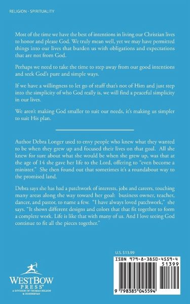 Most of the time we have the best of intentions in living our Christian lives to honor and please God. We truly mean well, yet we may have permitted things into our lives that burden us with obligations and expectations that are not from God. Perhaps we need to take the time to step away from our good intentions and seek God's pure and simple ways. If we have a willingness to let go of stuff that's not of Him and just step into the simplicity of who God really is, we will find a peaceful simplicity in our lives. We aren't making God smaller to suit our needs, it's making us simpler to suit His plan.…mehr