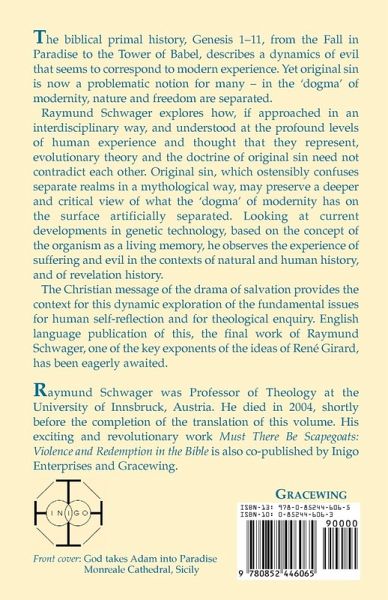 The biblical primal history, Genesis 1-11, from the Fall in Paradise to the Tower of Babel, describes a dynamics of evil that seems to correspond to modern experience. Yet original sin is now a problematic notion for many - in the 'dogma' of modernity, nature and freedom are separated. Raymund Schwager explores how, if approached in an interdisciplinary way, and understood at the profound levels of human experience and thought that they represent, evolutionary theory and the doctrine of original sin need not contradict each other. Original sin, which ostensibly confuses separate realms in a mythological way, may preserve a deeper and critical view of what the 'dogma' of modernity has on the surface artificially separated. Looking at current developments in genetic technology, based on the concept of the organism as a living memory, he observes the experience of suffering and evil in the contexts of natural and human history, and of revelation history. The Christian message of the drama of salvation provides the context for this dynamic exploration of the fundamental issues for human self-reflection and for theological enquiry. English language publication of this, the final work of Raymund Schwager, one of the key exponents of the ideas of René Girard, has been eagerly awaited. Raymund Schwager was Professor of Theology at the University of Innsbruck, Austria. He died in 2004, shortly before the completion of the translation of this volume. His exciting and revolutionary work Must There Be Scapegoats: Violence and Redemption in the Bible is also co-published by Inigo Enterprises and Gracewing.
