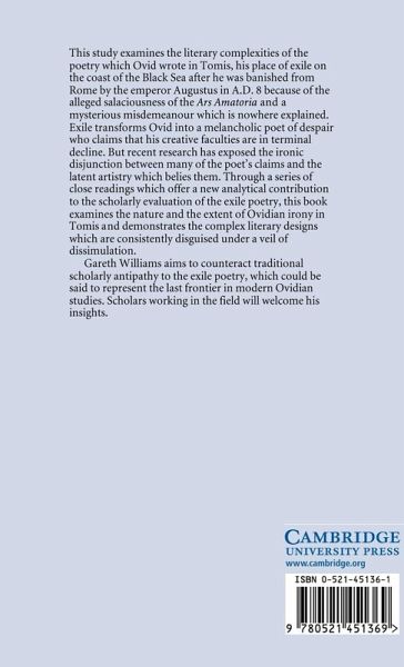 This study examines the literary complexities of the poetry which Ovid wrote in Tomis, his place of exile on the coast of the Black Sea after he was banished from Rome by the emperor Augustus in A.D. 8 because of the alleged salaciousness of the Ars Amatoria and a mysterious misdemeanour which is nowhere explained. Exile transforms Ovid into a melancholic poet of despair who claims that his creative faculties are in terminal decline. But recent research has exposed the ironic disjunction between many of the poet's claims and the latent artistry which belies them. Through a series of close readings which offer a new analytical contribution to the scholarly evaluation of the exile poetry, Dr Williams examines the nature and the extent of Ovidian irony in Tomis and demonstrates the complex literary designs which are consistently disguised under a veil of dissimulation. Gareth Williams aims to counteract traditional scholarly antipathy to the exile poetry, which could be said to represent the last frontier in modern Ovidian studies. Scholars working in the field will welcome his insights.
