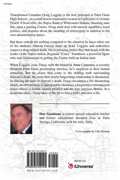 Transplanted Canadian Doug Loggins is the new principal at Palm Oasis High School-in a small desert community located in California's Colorado Desert. A local tribe, the Napoc Band of Whitewater Indians, flaunting state law, open a gaming Casino. Doug must deal with ancient squabbles, local politics, and disputes about the meaning of sovereignty in addition to his own administrative duties. But these ordeals are nothing compared to the situation he faces when one of his students, Simone Garcia, turns up dead. Loggins and authorities suspect a drug related death, but in pursuing justice they butt heads with the leader of the Napoc nation, Reginald "Cisco" Tramhurst, a powerful figure who was instrumental in getting the Casino built on Indian land. When Loggins joins forces with the beautiful Anna Carpenter, a recently divorced Palm Oasis prosecuting attorney, he's surprised at their instant attraction. But the closer they come to the chilling truth surrounding Simone's death, the more their newly burgeoning relationship is threatened. In chasing the links to Simone's death, Doug encounters a life threatening attack, an entrepreneur of questionable character, a frequently contumacious peace officer, a double named attorney and the true survivor, Brutus. In a desperate chase, Doug takes to the air to find a killer and save a life.