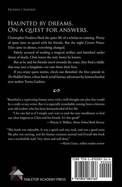 Who Stole the Magic Shard? Christopher Fredrico liked the quiet life of a scholar-in-training. Plenty of spare time to spend with his friends. But the night Crown Prince Tyler came to dinner, everything changed. Falsely accused of stealing a magical artifact and banished under threat of death, Chris leaves the only home he knows. But as he and his friends travel towards the coast, they find a riddle that may save a kingdom-or cost them their lives. If you enjoy quest stories, check out Banished - the first episode in The Riddled Stone, a four-book serial fantasy adventure by homeschooled teen author Teresa Gaskins.