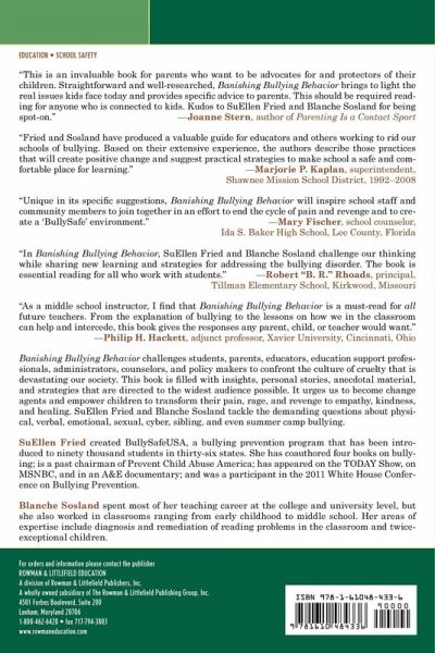 Chapter 1Transforming the Culture Chapter 2Dimensions and Overview of Bullying Chapter 3Back to Bullying Basics Chapter 4Getting Specific About Bullying Chapter 5Cyberbullying: Unimagined Cruelty Chapter 6Bully Free Summer Camps Chapter 7Bullying from Pre-School through Adolescence Chapter 8Helping Special Needs Students Achieve Success Chapter 9The Challenges of Changing the Culture Chapter 10Change Agents Chapter 11Empowering Students in the Solution Chapter 12Ten Burning Questions Chapter 13Parents as Protectors, Partners, and Change Agents Chapter 14Letters From the Children