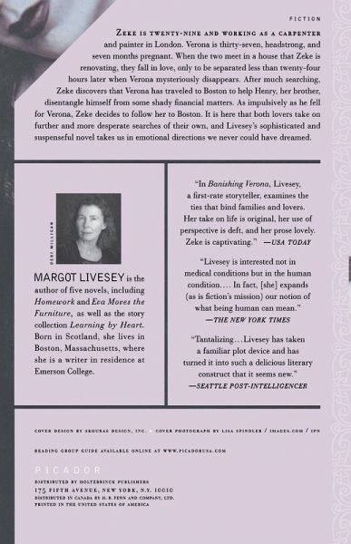 Zeke is twenty-nine and working as a carpenter and painter in London. Verona is thirty-seven, headstrong, and seven months pregnant. When the two meet in a house that Zeke is renovating, they fall in love, only to be separated less than 24 hours later when Verona mysteriously disappears. After much searching, Zeke discovers that Verona has travelled to Boston to help Henry, her brother, disentangle himself from some shady financial matters. As impulsively as he fell for Verona, Zeke decides to follow her to Boston. It is here that both lovers take on further and more desperate searches of their own, and Livesey's sophisticated novel, Banishing Verona , evolves into the most surprising and suspenseful of modern love stories.