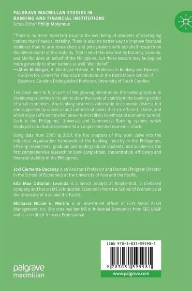 This book aims to form part of the growing literature on the banking system in developing countries in its aim to show the levels of stability in the banking sector of small economies. Any banking system is vulnerable to economic distress but one supported by universal and commercial banks that are efficient, stable, and which enjoy sufficient market power is most likely to withstand economic turmoil. Such is the Philippines' Universal and Commercial Banking system, which displayed remarkable resilience to unprecedented economic shock.