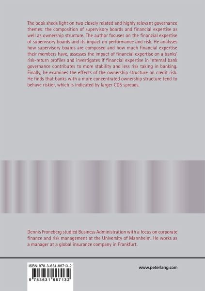 The book sheds light on two closely related and highly relevant governance themes: the composition of supervisory boards and financial expertise as well as ownership structure. The author focuses on the financial expertise of supervisory boards and its impact on performance and risk. He analyses how supervisory boards are composed and how much financial expertise their members have, assesses the impact of financial expertise on a banks' risk-return profiles and investigates if financial expertise in internal bank governance contributes to more stability and less risk taking in banking. Finally, he examines the effects of the ownership structure on credit risk. He finds that banks with a more concentrated ownership structure tend to behave riskier, which is indicated by larger CDS spreads.