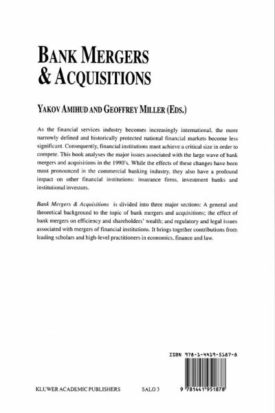 As the financial services industry becomes increasingly international, the more narrowly defined and historically protected national financial markets become less significant. Consequently, financial institutions must achieve a critical size in order to compete. Bank Mergers & Acquisitions analyses the major issues associated with the large wave of bank mergers and acquisitions in the 1990's. While the effects of these changes have been most pronounced in the commercial banking industry, they also have a profound impact on other financial institutions: insurance firms, investment banks, and institutional investors.