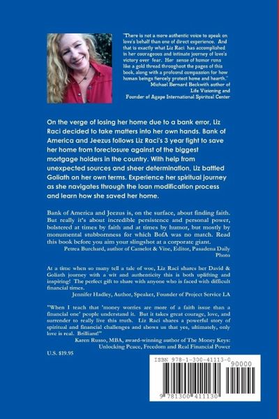 On the verge of losing her house due to a bank error, Liz Raci decided to take matters into her own hands. Bank of America and Jeezus follows Liz Raci's 3 year fight to save her home from foreclosure. With help from unexpected sources and sheer determination, Liz battled Goliath on her own terms.Experience her spiritual journey as she navigates through the loan modification process and learn how she saved her home.