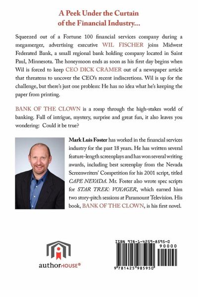 Squeezed out of a Fortune 100 financial services company during a megamerger, advertising executive WIL FISCHER joins Midwest Federated Bank, a small regional bank holding company located in Saint Paul, Minnesota. The honeymoon ends as soon as his first day begins when Wil is forced to keep CEO DICK CRAMER out of a newspaper article that threatens to uncover the CEO's recent indiscretions. Wil is up for the challenge, but there's just one problem: He has no idea what he's keeping the paper from printing. BANK OF THE CLOWN is a romp through the high-stakes world of banking. It's full of intrigue, mystery, surprise and great fun. Most of all, it leaves you wondering: Could it be true?