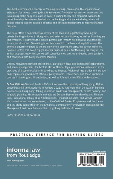 List of Tables Table of Cases Preface Acknowledgements List of Abbreviations Chapter 1 - Introduction Chapter 2 - Private Banking In Hong Kong Chapter 3 - Arbitration and Dispute Resolution for Banks in Hong Kong Chapter 4 - Unfolding The Clients' Perspective: Knowledge Versus Experience Chapter 5 - The Transformation of Disputes - Case Studies Chapter 6 - The Self-Corrective Mechanism for Dispute "Elimination" References