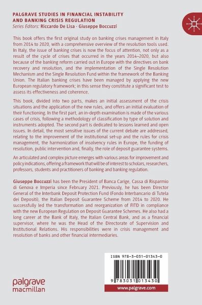 This book offers the first original study on banking crises management in Italy from 2014 to 2020 with a comprehensive overview of the resolution tools used. In Italy, the issue of banking crises is now the focus of attention, not only as a result of the cycle of crises that occurred in the years 2014-2020 but also because of the banking reform carried out in Europe with the directives on bank recovery and resolution and the implementation of the Single Resolution Mechanism and the Single Resolution Fund within the framework of the Banking Union. The Italian banking crises have been managed by applying the new European regulatory framework; in this sense they constitute a significant test to assess its effectiveness and coherence. This book, divided into two parts, makes an initial assessment of the crisis situations and the application of the new rules, and offers an initial evaluation of their functioning. In the first part, an in-depth examination is made of the various cases of crisis, following a methodology of classification by type of solution and instruments adopted. The second part is dedicated to lessons learned and open issues. In detail, the most sensitive issues of the current debate are addressed, relating to the improvement of the institutional set-up and the rules for crisis management, the harmonization of insolvency rules in Europe, the funding of resolution, public intervention and, finally, the role of deposit guarantee systems. An articulated and complex picture emerges with various areas for improvement and policy indications, offering a framework that will be of interest to scholars, researchers, professors, students and practitioners of banking and banking regulation.
