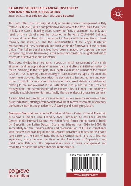This book offers the first original study on banking crises management in Italy from 2014 to 2020 with a comprehensive overview of the resolution tools used. In Italy, the issue of banking crises is now the focus of attention, not only as a result of the cycle of crises that occurred in the years 2014-2020 but also because of the banking reform carried out in Europe with the directives on bank recovery and resolution and the implementation of the Single Resolution Mechanism and the Single Resolution Fund within the framework of the Banking Union. The Italian banking crises have been managed by applying the new European regulatory framework; in this sense they constitute a significant test to assess its effectiveness and coherence. This book, divided into two parts, makes an initial assessment of the crisis situations and the application of the new rules, and offers an initial evaluation of their functioning. In the first part, an in-depth examination is made of the various cases of crisis, following a methodology of classification by type of solution and instruments adopted. The second part is dedicated to lessons learned and open issues. In detail, the most sensitive issues of the current debate are addressed, relating to the improvement of the institutional set-up and the rules for crisis management, the harmonization of insolvency rules in Europe, the funding of resolution, public intervention and, finally, the role of deposit guarantee systems. An articulated and complex picture emerges with various areas for improvement and policy indications, offering a framework that will be of interest to scholars, researchers, professors, students and practitioners of banking and banking regulation.