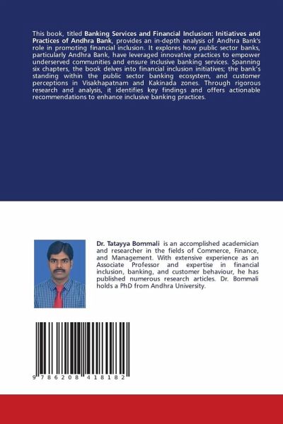 This book, titled Banking Services and Financial Inclusion: Initiatives and Practices of Andhra Bank, provides an in-depth analysis of Andhra Bank's role in promoting financial inclusion. It explores how public sector banks, particularly Andhra Bank, have leveraged innovative practices to empower underserved communities and ensure inclusive banking services. Spanning six chapters, the book delves into financial inclusion initiatives; the bank's standing within the public sector banking ecosystem, and customer perceptions in Visakhapatnam and Kakinada zones. Through rigorous research and analysis, it identifies key findings and offers actionable recommendations to enhance inclusive banking practices.