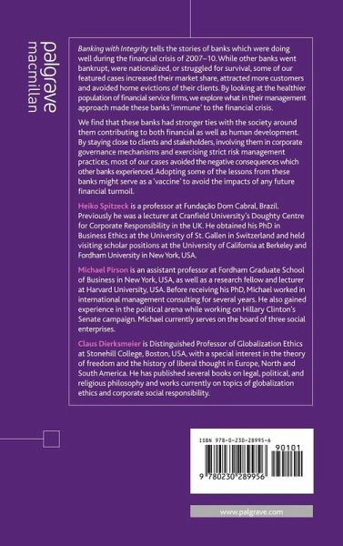 Banking with Integrity provides rich and in-depth case studies of banks which were doing well during the financial crisis of 2007-2010. While other banks went bankrupt, were nationalized, or struggled for survival some of the featured cases increased market share, attracted more customers and avoided home evictions of their clients.