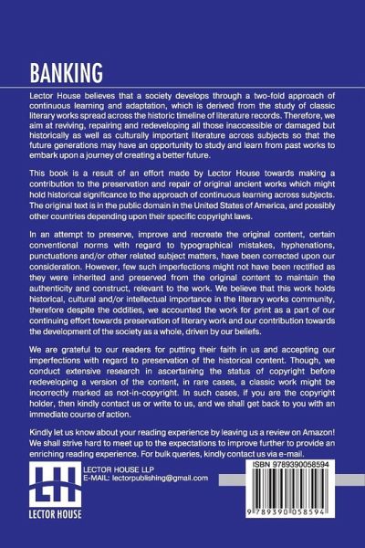 Banking This book is a result of an effort made by us towards making a contribution to the preservation and repair of original classic literature. In an attempt to preserve, improve and recreate the original content, we have worked towards: 1. Type-setting & Reformatting: The complete work has been re-designed via professional layout, formatting and type-setting tools to re-create the same edition with rich typography, graphics, high quality images, and table elements, giving our readers the feel of holding a 'fresh and newly' reprinted and/or revised edition, as opposed to other scanned & printed (Optical Character Recognition - OCR) reproductions. 2. Correction of imperfections: As the work was re-created from the scratch, therefore, it was vetted to rectify certain conventional norms with regard to typographical mistakes, hyphenations, punctuations, blurred images, missing content/pages, and/or other related subject matters, upon our consideration. Every attempt was made to rectify the imperfections related to omitted constructs in the original edition via other references. However, a few of such imperfections which could not be rectified due to intentional\unintentional omission of content in the original edition, were inherited and preserved from the original work to maintain the authenticity and construct, relevant to the work. We believe that this work holds historical, cultural and/or intellectual importance in the literary works community, therefore despite the oddities, we accounted the work for print as a part of our continuing effort towards preservation of literary work and our contribution towards the development of the society as a whole, driven by our beliefs. We are grateful to our readers for putting their faith in us and accepting our imperfections with regard to preservation of the historical content. HAPPY READING!