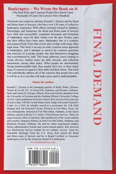 Bankruptcy - We Wrote the Book on It (The Real Story and Concerns People Have Based Upon Thousands of Cases our Lawyers Have Handled) This book was written by attorney Ronald C Sykstus and the Bond and Botes team of lawyers who have over 150 years of collective bankruptcy experience. With offices currently located in Alabama, Mississippi and Tennessee, the Bond and Botes team of lawyers have filed and successfully completed thousands and thousands of bankruptcy cases for their clients. Bankruptcy law is a complex and nuanced field of law that covers and overlaps with a lot of other legal areas. This book is an easy to read, common sense approach to bankruptcy and it attempts to answer the common questions and concerns of everyday people who find themselves struggling and overwhelmed by debt. This book addresses the issues that people have as it relates to credit, divorce, student loans, tax debt, lawsuits and collection harassment, among other topics. When people are unfortunately facing unsurmountable debt, they usually have two or three major areas of concern as it relates to their debts and their future. This book will undoubtedly address all of the concerns that people have and it will do so in a way that will make sense and be understandable.