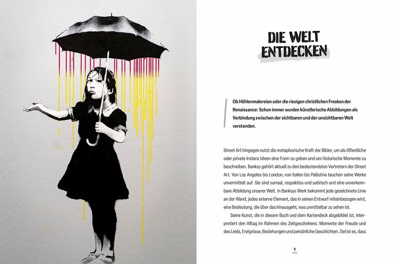 Wie altägyptische Hieroglyphen vermittelt die Kunst Banksys über eine ikonische Bildsprache komplexe Botschaften. Banskys Werke fordern die Betrachter:innen im Vorbeigehen zum Nachdenken auf - über aktuelle Ereignisse, die eigene Rolle in der Gesellschaft - und regen an, die Realität mit einem kritischen Auge zu betrachten und sich selbst und andere zu hinterfragen. Dieses Banksy-Kartenset enthält 40 lustige, bedeutsame und moderne Motive, aus denen sich Orakelbotschaften deuten lassen. Ein innovatives Set mit Kartensatz und Begleitbuch zum Stellen der größeren und differenzierteren Fragen über das Leben und unseren Platz in der Welt.