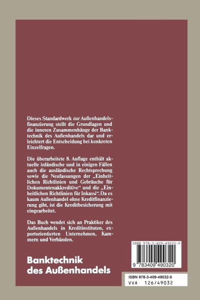 1. Exporteure, Importeure und Banken.- 2. Rechtsquellen.- 3. Formen des Zahlungsverkehrs im Außenhandel.- 4. Die rechtlichen Grundlagen des Akkreditiv-Verhältnisses.- 5. Bestätigtes und unbestätigtes Akkreditiv.- 6. Die Haftung aus Akkreditiven.- 7. Akkreditivgestaltung.- 8. Die Dokumente im Bereich dokumentärer Geschäfte.- 9. Rembourskredit.- 10. Der Wechsel im Außenhandel.- 11. Anschlußfinanzierung.- 12. Winke für die bankmäßige Behandlung von Akkreditiven.- 13. Bankgarantien.- 14. Kurssicherung.- 15. Exportversicherung.- 16. Finanzierung des Außenhandels.- 17. Problemfälle im dokumentären Bereich bei Kundenkonkurs.- 18. Gerichtliche Eilmaßnahmen im Bereich dokumentärer Geschäfte.- I. Einheitliche Richtlinien und Gebräuche für Dokumenten-Akkreditive (Revision 1983).- II. Einheitliche Richtlinien für Inkassi (Revision (1978).- III. Verzeichnis einschlägiger Publikationen der Internationalen Handelskammer (Auswahl).- Stichwortverzeichnis.