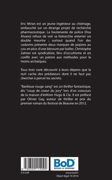 Eric Miran est un jeune ingénieur au chômage, embauché sur un étrange projet de recherche pharmaceutique. La lieutenante de police Elisa Alvarez refuse de voir sa hiérarchie enterrer un double meurtre ; surtout quand l'un des cadavres présente deux marques de piqûres au cou en plus d'une blessure par balles. Christophe Zalmer est syndicaliste, féru d'occultisme et en conflit avec un patron aux méthodes pour le moins archaïques.Tous trois vont découvrir à leurs dépens que la nuit cache des prédateurs dont il ne faut pas chercher à percer les secrets."Banlieue rouge sang" est un thriller fantastique, élu "coup de coeur du jury" lors d'un concours de la maison d'édition Hugo & Cie. Il est préfacé par Olivier Gay, auteur de thriller et prix du premier roman du festival de Beaune en 2012.