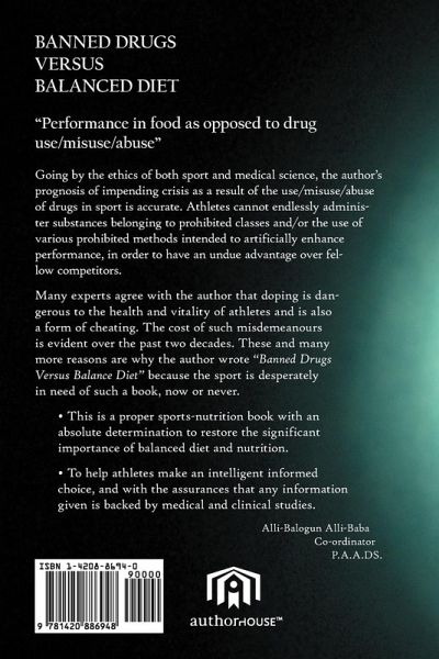 BANNED DRUGS VERSUS BALANCED DIET "Performance in food as opposed to drug use/misuse/abuse" Going by the ethics of both sport and medical science, the author's prognosis of impending crisis as a result of the use/misuse/abuse of drugs in sport is accurate. Athletes cannot endlessly administer substances belonging to prohibited classes and/or the use of various prohibited methods intended to artificially enhance performance, in order to have an undue advantage over fellow competitors. Many experts agree with the author that doping is dangerous to the health and vitality of athletes and is also a form of cheating. The cost of such misdemeanours is evident over the past two decades. This and many more reasons are why the author wrote "Banned Drugs Versus Balance Diet" because the sport is desperately in need of such a book, now or never. This is a proper sports-nutrition book with an absolute determination to restore the significant importance of balanced diet and nutrition. To help athletes make an intelligent informed choice, and with the assurances that any information given is backed by medical and clinical studies. Alli-Balogun Alli-Baba Co-ordinator P.A.A.DS.