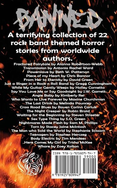A drabble introduction to a terrifying collection of 22 rock band themed horror stories from worldwide authors. Best read with the lights on...if you're brave enough... Fractured Fairytale by Alanna Robertson-Webb Transmission by Antonia Rachel Ward Powerslave by Beth W. Patterson Piece of my Heart by Chris Bannor From Her to Eternity by David Green Just a Singer in a Rock n Roll Band by Gregg Cunningham While My Guitar Gently Weeps by Holley Cornetto Say You Love Me or Say Goodnight by J.W. Garrett Angie Baby by Kimberly Rei Who Wants to Live Forever by Maxine Churchman The Last Drink by Melinda Pouncey Cross Road Blues by Raven Corinn Carluk The Night Creeper by Robin Braid Waiting for the Beginning by Steven Streeter Sex Type Thing by S.O. Green Nightmares Made Flesh by Sam M. Phillips Torn by Stacey Jaine McIntosh The Man who Sold the World by Stephanie Scissom Teenagers by Stephen Herczeg Body Electric by Tim Mendees Here Comes My Girl by Trisha McKee Whore by Zoey Xolton