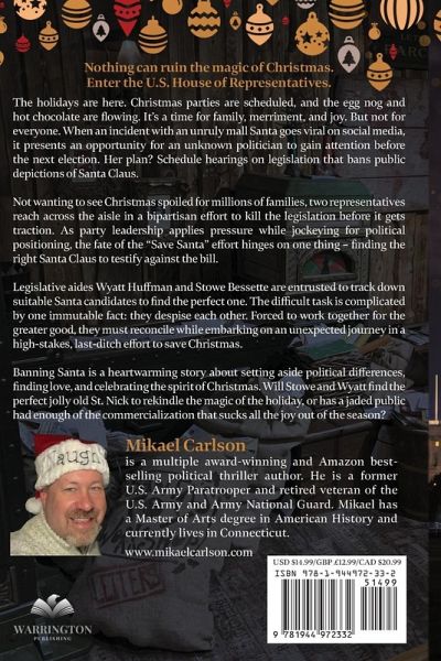 Nothing can ruin the magic of Christmas. Enter the U.S. House of Representatives. Award-winning political fiction author Mikael Carlson spins a uplifting tale of romance, adventure, and political maneuvering that is part Hallmark Christmas movie, part House of Cards. Banning Santa is a heartwarming story about setting aside political differences, finding love, and celebrating the spirit of Christmas. Will Stowe and Wyatt find the perfect jolly old St. Nick to rekindle the magic of the holiday, or has a jaded public had enough of the commercialization that sucks all the joy out of the season? The holidays should be a special time to enjoy with friends and family This is not a partisan or ideological right vs. left slugfest. There is enough of that in the world already. Banning Santa is an inspirational story about defending beliefs, setting aside differences, falling in love, understanding mythology, and capturing the true meaning and spirit of Christmas. It is the perfect novel for anyone weary of holiday stress and could use some Christmas cheer! Santa Claus is not unlike Congress: They both hand out gifts, keep naughty and nice lists, and don't work most of the year. The only difference is people like Santa. The holidays are here. Christmas parties are scheduled, and the egg nog and hot chocolate are flowing. It's a time for family, merriment, and joy. But not for everyone. When an incident with an unruly mall Santa goes viral on social media, it presents an opportunity for an unknown politician to gain attention before the next election. Her plan? Schedule hearings on legislation that bans public depictions of Santa Claus. Not wanting to see Christmas spoiled for millions of families, two representatives reach across the aisle in a bipartisan effort to kill the legislation before it gets traction. As party leadership applies pressure while jockeying for political positioning, the fate of the "Save Santa" effort hinges on one thing - finding the right Santa Claus to testify against the bill. Legislative aides Wyatt Huffman and Stowe Bessette are entrusted to track down suitable Santa candidates to find the perfect one. The difficult task is complicated by one immutable fact: they despise each other. Forced to work together for the greater good, they must reconcile while embarking on an unexpected journey in a high-stakes, last-ditch effort to save Christmas. Buy your copy today! For updates on Mikael Carlson's new releases, sign up for his newsletter at mikaelcarlson.com.