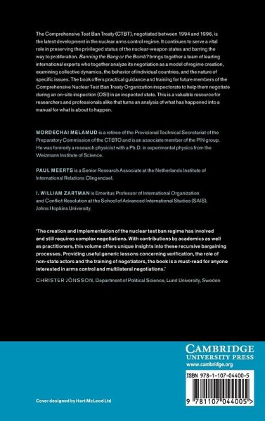 The Comprehensive Test Ban Treaty (CTBT), negotiated between 1994 and 1996, is the latest development in the nuclear arms control regime. It continues to serve a vital role in preserving the privileged status of the nuclear weapons states and barring the way to proliferation. Banning the Bang or the Bomb? brings together a team of leading international experts who together analyse its negotiation as a model of regime creation, examining collective dynamics, the behaviour of individual countries, and the nature of specific issues. The book offers practical guidance and training for members of the Comprehensive Nuclear Test Ban Treaty Organization future inspectorate to help negotiate their way during an on-site inspection (OSI) in an inspected state. This is a valuable resource for researchers and professionals alike that turns an analysis of what has happened into a manual for what is about to happen.