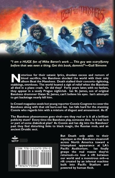 Notorious for their satanic lyrics, drunken excess and rumors of blood sacrifice, the Banshees shocked the world with their only album Beat the Manshees. Death stalked their concerts--lightning, stabbings, overdoses. The world heaved a sigh of relief when the Banshees all died in a plane crash. Or did they? Forty years later, with no fanfare, they appear in a seedy Prague nightclub. Ian St. James, son of original Banshees drummer Oaian St. James, can't believe his eyes. Ian's attempts to get backstage nearly kill him. In Crowd sends hot young reporter Connie Cosgrove to cover the Banshees along with that old burn-out Ian. Ian falls hard for the stunning Connie who regards him with a mixture of disgust and amusement. As if! The Banshees phenomenon goes viral--are they real or is it all a brilliant publicity stunt? Every time Banshees play someone dies. Is it bad luck or part of some diabolical plan? As Connie and Ian dig into the Banshees' past they find disturbing links to black magic, the Russian mob and an ancient Druidic sect. Death only adds to their mystique as the Banshees steamroll across North America toward a triumphant appearance at LA's Pacific Auditorium. Ian finally grasps the real reason they've returned--to tear a rift between our world and a monstrous evil-- a rift created by an infernal machine built into Pacific Stadium and powered by human flesh. "I am a HUGE fan of Mike Baron's work. The biggest influence on my Catman interpretation was the Badger, without question.This guy was scary/funny before that was even a thing. Get this book, dammit!" --Gail Simone "Baron's book is a rocket blast of suspense that moves at breakneck speed. Along the way it is crammed with hundreds of hilarious cultural bon mots and innuendos that set it leagues above other mundane horror tales. "Banshees" is a brilliant achievement by a creative force that is just getting warmed up." --PULP FICTION REVIEWS "Horror buffs and metal fans will marvel at every grinding detail in this meaty, grim fantasy." (BookLife) —Publishers Weekly starred review