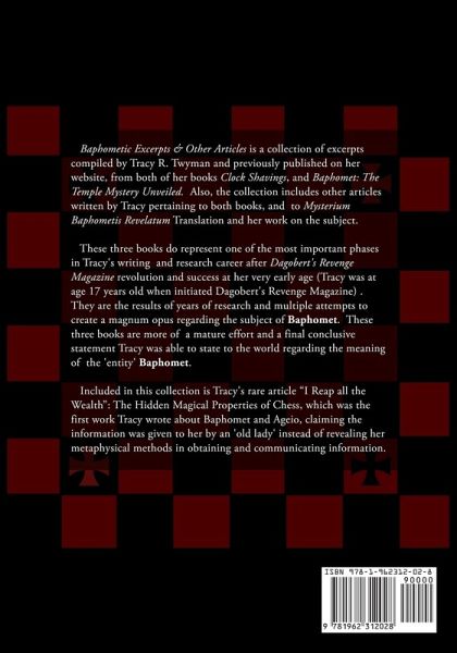 Baphometic Excerpts & Other Articles is a collection of excerpts compiled by Tracy R. Twyman and previously published on her website, from both of her books Clock Shavings, and Baphomet: The Temple Mystery Unveiled. Also, the collection includes other articles written by Tracy pertaining to both books, and to Mysterium Baphometis Revelatum Translation and her work on the subject. These three books do represent one of the most important phases in Tracy's writing and research career after Dagobert's Revenge Magazine revolution and success at her very early age (Tracy was at age 17 years old when initiated Dagobert's Revenge Magazine) . They are the results of years of research and multiple attempts to create a magnum opus regarding the subject of Baphomet. These three books are more of a mature effort and a final conclusive statement Tracy was able to state to the world regarding the meaning of the 'entity' Baphomet. Content: Excerpts From Clock ShavingsYear Zero, The Cubic Stone, The New Jerusalem, And The Pillars Of Heaven: Excerpts From Clock Shavings Chess, Ageio And The Second Square: Excerpts From Clock Shavings Alchemical Ageio Symbolism In Dali's "Corpus Hypercubus"? The Gospel According To Baphomet: Excerpts From Clock Shavings The Apocalypse Of Baphomet: Excerpts From Clock Shavings The Bread Of Heaven, The Water Of Life, And The Plant Of Immortality: Excerpts From Clock Shavings The Scholomance And Fishing For Men: Excerpts From Clock Shavings And Regnum In Potentia "I Reap All The Wealth": The Hidden Magical Properties Of Chess 'Noah' film review: Tubal-Cain almost 'reaps all the wealth' Beyonce Beyond Coincidence? A connection between "Fierce Queen B" and Baphomet's "Ageio" game Leviathan Fields Forever! The True Meaning Of 'Clock Shavings': A Letter From A Reader Q: Why Is My New Book Called Clock Shavings? Questions For Tracy R. Twyman About Her Book Clock Shavings Excerpt From Baphomet: The Temple Mystery UnveiledLet The Heavens Fall: The Rites Of Destruction The Real Meaning Of The Baptism Of Wisdom: Excerpt From Baphomet: The Temple Mystery Unveiled The Kaaba, The Dome Of The Rock And Solomon's Temple In Masonic Templar Traditions John, The Head Of Prophecy John The Baptist As The Baphometic Wild Man The Goat-Faced Wild Man The Secret Templar Rule And The Book Of The Baptism Of Fire Hermes, Sabians, And Islam. Traditions Of Hermes In Islamic And Pre-Islamic Sources Cathars And Cat Worship Timeless Wisdom Of The Picatrix Mysterium Baphometis ArticlesPress Release: American Writers Find Alleged "Templar Artifacts" Relating To "Baphomet" Hiding In Plain Sight At British Museum Found Again: The "Templar Artifacts" Of Hammer-Purgstall The coffers in the catalogue of the British Museum A Letter To Jesse Hammer-Purgstall Video Script The Chinon Parchment And The Church Apologia On The Templars The Biscione, Baphomet, the Bitch-Goddess Success, and other Beasts: Documentary [Advertisement] The Biscione And The Mystery Of The Various Ottos-Sea Monsters, Templars, European Royalty & Scaligerian Chronology: Excerpts From Meet Mete [Reconstructed Article] Was Baphomet A Golem Animated By Sperm, Sigils, And Incantations?: Excerpts From Meet Mete [Reconstructed Article] The Alerion, The Fleur-De-Lys, The House Of Lorraine, The Evil Eye, And The Flying Penis God Who Spawned A Royal Race: Excerpts From Meet Mete [Reconstructed Article]