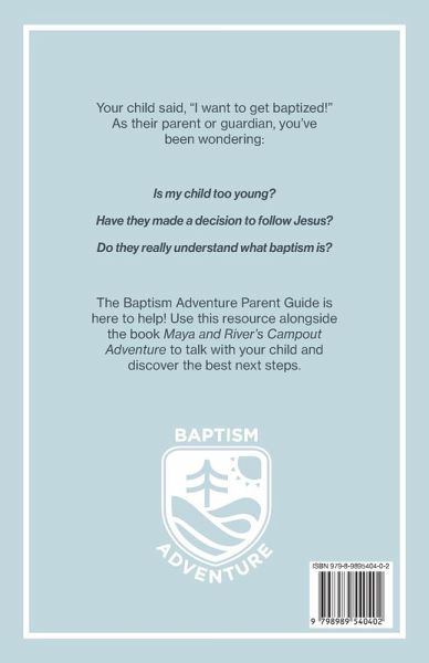 The Baptism Adventure Parent Guide is a companion book to the children's storybook Maya and River's Campout Adventure. Use this guide to walk alongside your child on their faith journey and decide if they are ready for baptism. You will ask them questions about the book, their faith, and the ABCs of salvation. Biblical truths to share with your child are sprinkled throughout the guide, as well as practical steps they can take to move forward in their faith. This resource will be a great way to connect with your child and help them as they start the adventure of a lifetime!