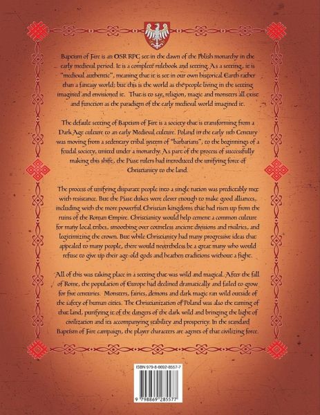 Baptism of Fire is an OSR RPG set in the dawn of the Polish monarchy in the early medieval period. It is a complete rulebook and setting. As a setting, it is "medieval authentic," meaning that it is set in our own historical Earth rather than a fantasy world, but this is the world as the people living in the setting imagined and envisioned it. That is to say, religion, magic, and monsters all exist and function as the paradigm of the early medieval world imagined. The default setting of Baptism of Fire is a society that is transforming from a Dark Age culture to an early Medieval culture. Poland in the early 11th Century was moving from a sedentary tribal system of "barbarians", to the beginnings of a feudal society, united under a monarchy. As part of the process of successfully making this shift, the Piast rulers introduced the unifying force of Christianity to the land. The process of unifying disparate people into a single nation was predictably met with resistance. But the Piast dukes were clever enough to make good alliances, including with the more powerful Christian kingdoms that had risen up from the ruins of the Roman Empire. Christianity would help cement a common culture for many local tribes, smoothing over countless ancient divisions and rivalries, and legitimizing the crown. But while Christianity had many progressive ideas that appealed to many people, there would nevertheless be a great many who would refuse to give up their age-old gods and heathen traditions without a fight. All of this was taking place in a setting that was wild and magical. After the fall of Rome, the population of Europe declined dramatically and failed to grow for five centuries. Monsters, fairies, demons, and dark magic ran wild outside of the safety of human cities. The Christianization of Poland was also the taming of that land, purifying it of the dangers of the dark wild and bringing the light of civilization and its accompanying stability and prosperity. In the standard Baptism of Fire campaign, the player characters are agents of that civilizing force.