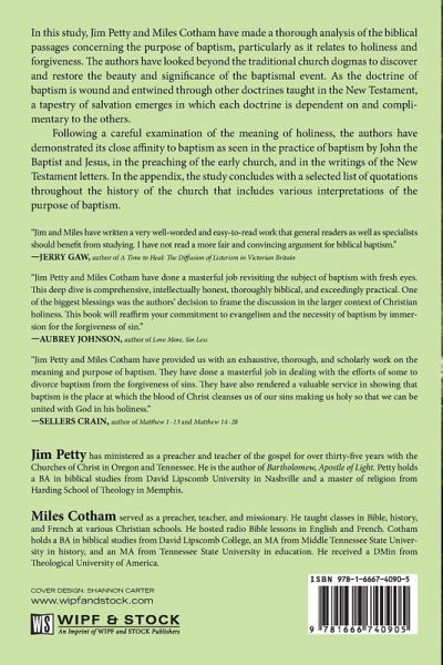 In this study, Jim Petty and Miles Cotham have made a thorough analysis of the biblical passages concerning the purpose of baptism, particularly as it relates to holiness and forgiveness. The authors have looked beyond the traditional church dogmas to discover and restore the beauty and significance of the baptismal event. As the doctrine of baptism is wound and entwined through other doctrines taught in the New Testament, a tapestry of salvation emerges in which each doctrine is dependent on and complimentary to the others. Following a careful examination of the meaning of holiness, the authors have demonstrated its close affinity to baptism as seen in the practice of baptism by John the Baptist and Jesus, in the preaching of the early church, and in the writings of the New Testament letters. In the appendix, the study concludes with a selected list of quotations throughout the history of the church that includes various interpretations of the purpose of baptism.