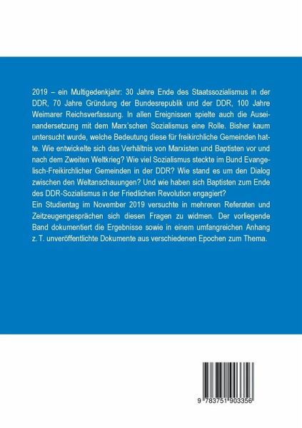 2019 - ein Multigedenkjahr: 30 Jahre Ende des Staatssozialismus in der DDR, 70 Jahre Gründung der Bundesrepublik und der DDR, 100 Jahre Weimarer Reichsverfassung. In allen Ereignissen spielte auch die Auseinandersetzung mit dem Marx'schen Sozialismus eine Rolle. Bisher kaum untersucht wurde, welche Bedeutung diese für freikirchliche Gemeinden hatte. Wie entwickelte sich das Verhältnis von Marxisten und Baptisten vor und nach dem Zweiten Weltkrieg? Wie viel Sozialismus steckte im Bund Evangelisch-Freikirchlicher Gemeinden in der DDR? Wie stand es um den Dialog zwischen den Weltanschauungen? Und wie haben sich Baptisten zum Ende des Staatssozialismus in der Friedlichen Revolution engagiert?Ein Studientag im November 2019 versuchte in mehreren Referaten und Zeitzeugengesprächen sich diesen Fragen zu widmen. Der vorliegende Band dokumentiert die Ergebnisse sowie in einem umfangreichen Anhang z.T. unveröffentlichte Dokumente aus verschiedenen Epochen zum Thema.