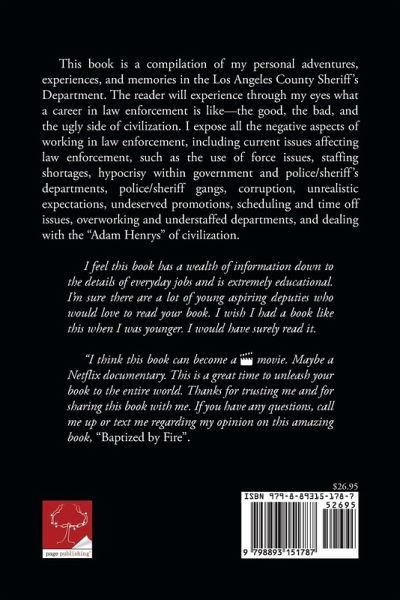 This book is a compilation of my personal adventures, experiences, and memories in the Los Angeles County Sheriff's Department. The reader will experience through my eyes what a career in law enforcement is like--the good, the bad, and the ugly side of civilization. I expose all the negative aspects of working in law enforcement, including current issues affecting law enforcement, such as the use of force issues, staffing shortages, hypocrisy within government and police/sheriff's departments, police/sheriff gangs, corruption, unrealistic expectations, undeserved promotions, scheduling and time off issues, overworking and understaffed departments, and dealing with the "Adam Henrys" of civilization. I feel this book has a wealth of information down to the details of everyday jobs and is extremely educational. I'm sure there are a lot of young aspiring deputies who would love to read your book. I wish I had a book like this when I was younger. I would have surely read it. "I think this book can become a movie. Maybe a Netflix documentary. This is a great time to unleash your book to the entire world. Thanks for trusting me and for sharing this book with me. If you have any questions, call me up or text me regarding my opinion on this amazing book, "Baptized by Fire".