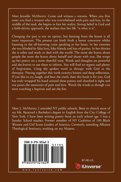 Meet Jennifer McMurtry. Come and witness a witness. When you first enter you find a woman who was overwhelmed with pain and loss. In the middle of the read, she begins to face her reality. Strong belief in God and a faith-driven approach, she realizes that her life "is what it is". Changing the past is not an option, but learning from the lesson is all more important. The present can birth forth a better tomorrow whilst listening to the all-knowing voice speaking to her heart. In her twenties she was blinded by false love, fake-friends and lots of parties. In her thirties she is sober and ready to deal with the world. The more she learns about people the more she learns about herself and shares with you. She wraps up her poetry on a more cheerful note. Words and thoughts are powerful and she knows to use them to inform. You will find no regrets and plenty of forgiveness. Using the spoken word as therapy with God as the therapist. Piecing together this work conveys honest and deep reflections. If you like to cry, laugh, and hear the truth, then this book is for you. God has truly wrapped his hand around these poems and clutched it tight and out pours the memories of pain and love. Watch the words as though you were watching a baptism and see the fire.