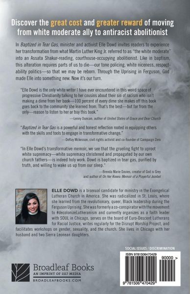 For years Elle Dowd considered herself an advocate for justice, but her well-meaning support always took a back burner to what Martin Luther King Jr. called the tension-free, ordered ""negative peace"" of white moderates. Then Michael Brown, a Black man, was murdered by a white police officer in Ferguson, Missouri, and the subsequent Uprising changed everything. In Baptized in Tear Gas, minister and activist Elle Dowd tells the gripping story of her transformation into an Assata Shakur-reading, courthouse-occupying abolitionist with an arrest record, hungry for the revolution.