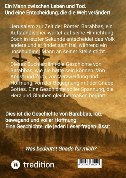 Barabbas: Die Geschichte der GnadeWas wissen wir über Barabbas?Er taucht in allen vier Evangelien der Bibel auf und bleibt doch eine der geheimnisvollsten Figuren der Passionsgeschichte. Ein Mann, der verurteilt war, zu sterben. Ein Mann, dessen Name von den Massen gerufen wurde, nicht, weil sie ihn liebten, sondern weil sie ihn anstelle Jesu freigaben.Ein Überblick über die GeschichteBarabbas, der Name eines Mannes, der in der Passionsgeschichte Jesu wie ein Schatten auftaucht. Ein Mann, der schuldig war, der sein Leben im Kampf, im Hass und in der Rebellion gegen Rom führte. Dieses Buch erzählt seine Geschichte, wie sie gewesen sein könnte, eine Geschichte von Schuld, Angst, Gnade und innerer Verwandlung.Gefangen im KerkerZu Beginn lernen wir Barabbas kennen wie er aufgewachsen ist und dann geht es auch schon weiter und Barabbas sitzt in einer dunklen Zelle. Er weiß, dass sein Todesurteil feststeht. Kreuzigung, die brutalste aller Hinrichtungen. Gemeinsam mit seinen Mitstreitern Ahmet und Achmón wartet er auf den Tag der Vollstreckung. Die Stunden ziehen sich dahin, voller Hunger, Schmerzen und wilder Gedanken. Barabbas denkt an seine Familie, an seine Mutter, die ihn einst gewarnt hatte, und an das Leben, das er führte, voller Gewalt und Blut.Die Henkersmahlzeit und AlpträumeAls die Henkersmahlzeit gebracht wird, scheint das Ende greifbar nah. Barabbas ringt mit seiner Angst, die Nacht ist voller Alpträume. Er sieht sich selbst am Kreuz, hört die Schreie seiner Kameraden und erlebt das Grauen, das vor ihm liegt.Das Rufen der MengeAm nächsten Morgen dringt Lärm von draußen in den Kerker. "Kreuzige ihn!", diese Worte lassen Barabbas glauben, dass seine Stunde gekommen ist. Die Soldaten holen ihn, führen ihn aus der Dunkelheit in das gleißende Licht des Hofes.Vor PilatusHier steht Barabbas plötzlich einem zerschlagenen, gequälten Mann gegenüber. Jesus von Nazareth. Pilatus lässt das Volk entscheiden und die Menge schreit den Namen von Barabbas. Er wird freigesprochen, obwohl er der Schuldige ist. Der andere Mann soll sterben.Golgatha und die KreuzeBarabbas wird von der Menge mitgerissen und steht schließlich vor dem Hügel Golgatha. Dort sieht er seine Kameraden am Kreuz, und zwischen ihnen hängt Jesus. Barabbas erkennt. Dieser Mann stirbt an meiner Stelle.Die Worte vom Kreuz"Vater, vergib ihnen...", diese Worte lassen Barabbas erzittern. Er hört, wie Ahmet und Achmón mit Jesus sprechen, wie einer von ihnen plötzlich Frieden findet. Die Finsternis am Kreuz, die letzten Worte Jesu, all das erschüttert Barabbas bis ins Innerste.Nach drei Tagen und das leere GrabGerüchte von der Auferstehung machen in Jerusalem die Runde. Barabbas trifft Maria Magdalena, die bezeugt, "Er lebt!". Für Barabbas beginnt eine Reise der Fragen. Warum starb Jesus für ihn? Was bedeutet Vergebung?Von Schuld zu GnadeBarabbas beobachtet die Jünger, hört ihre Worte über Gnade und Vergebung. Zum ersten Mal in seinem Leben spürt er Frieden, nicht durch Gewalt oder Rache, sondern durch die unverdiente Liebe, die er erfahren hat.Das Ende und eine Botschaft für alleBarabbas begreift. Seine Geschichte ist ein Bild für uns alle. Wir alle sind wie Barabbas, schuldig und doch geliebt, verloren und doch gerettet. Er erkennt, dass das Kreuz Jesu der Ort ist, an dem Gnade beginnt.