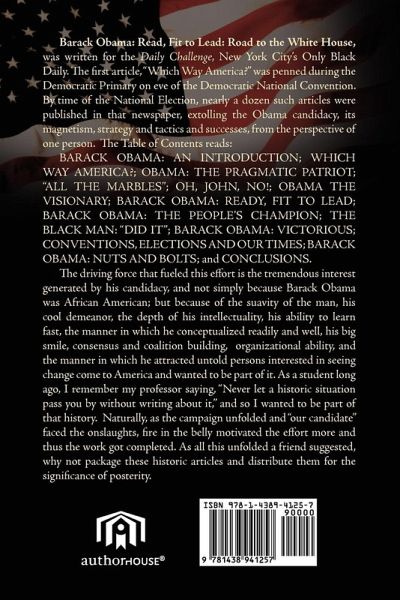 ABOUT THE BOOK Barack Obama: Read, Fit to Lead: Road to the White House, was written for the Daily Challenge, New York City's Only Black Daily newspaper. The first article, "Which Way America?" was penned during the Democratic Primary on eve of the Democratic National Convention. By time of the National Election, nearly a dozen such articles were published in that newspaper, extolling Obama's candidacy, magnetism, strategy, tactics and successes, from the perspective of one person. Table of Contents reads: BARACK OBAMA: AN INTRODUCTION; WHICH WAY AMERICA?; OBAMA: THE PRAGMATIC PATRIOT; "ALL THE MARBLES"; OH, JOHN, NO!; OBAMA THE VISIONARY; BARACK OBAMA: READY, FIT TO LEAD; BARACK OBAMA: THE PEOPLE'S CHAMPION; THE BLACK MAN: "DID IT"; BARACK OBAMA: VICTORIOUS; CONVENTIONS, ELECTIONS AND OUR TIMES; BARACK OBAMA: NUTS AND BOLTS; CONCLUSIONS; BARACK OBAMA: A CONCLUDINJG PERSPECTIVE. The driving force that fueled this effort is the tremendous interest generated by his candidacy, and not simply because BaraCk Obama was African American; but because of the suavity of the man, his cool demeanor, the depth of his intellectuality, his ability to learn fast, the manner in which he conceptualized readily and well, his big smile, consensus and coalition building, and organizational ability, and the manner in which he attracted untold persons interested in seeing change come to America and wanting to be part of it. As a student long ago, I remember my Professor saying, "Never let a historic situation pass you by without writing about it," and so I wanted to be part of that history. Naturally, as the campaign unfolded and "our candidate" faced the onslaughts, fire in the belly motivated the effort more and thus the work got completed. As all this unfolded a friend suggested, why not package these historic articles and distribute them for the significance of posterity.