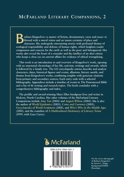 Barbara Kingsolver--a writer of fiction, documentary, verse and essay--supports entertaining stories with profound themes of ecological responsibility and defense of human rights. This work is an introduction and overview of the author's literary achievements, opening with an annotated chronology of Kingsolver's life, activism, works, and awards, followed by a family tree. The 122 alphabetical entries in the main text provide data and analysis on characters, dates, historical figures and events, allusions, literary motifs, and themes from Kingsolver's works, combining insights with generous citations from primary and secondary sources. Each entry concludes with a selected bibliography. Appendices include a timeline of events in The Poisonwood Bible, a list of 46 writing and research topics, a bibliography, and a comprehensive index.