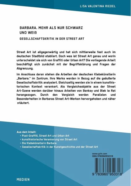 Street Art ist allgegenwärtig und hat sich mittlerweile fest auch im deutschen Stadtbild etabliert. Doch was ist Street Art genau und worin unterscheidet sie sich von Graffiti oder Urban Art? Die vorliegende Arbeit beschäftigt sich zunächst mit der Begriffsklärung und Fragen der Abgrenzung. Im Anschluss daran stehen die Arbeiten der deutschen Klebekünstlerin "Barbara." im Zentrum. Ihre Werke werden in Bezug auf die geäußerte Gesellschaftskritik analysiert. Gleichzeitig werden sie in einem kunsthistorischen Kontext verankert. Als Vergleichsobjekte aus der Street Art-Szene werden darüber hinaus Arbeiten von Banksy und Blek le Rat herangezogen. Durch den Vergleich werden Parallelen und Besonderheiten in Barbaras Street Art-Werken hervorgehoben und näher erläutert.Aus dem Inhalt:- Post-Graffiti, Street Art und Urban Art;- kunsthistorische Verankerung von Street Art;- Die Klebekünstlerin Barbara.;- Gesellschaftskritik in der Kunstgeschichte und der Street Art