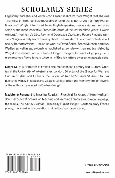 Debra Kelly is Professor of French and Francophone Literary and Cultural Studies at the University of Westminster, London, Director of the Group for War and Culture Studies, and Editor of the "Journal of War and Culture Studies." She has published widely in textual and visual studies and cultural memory, and on several of the authors translated by Barbara Wright. Madeleine Renouard is Emeritus Reader in French at Birkbeck, University of London. Her publications are on teaching and learning French as a foreign language, the media, the "nouveau roman" (especially Robert Pinget), contemporary French poetry, the visual arts, semiotics, and writers' correspondence.