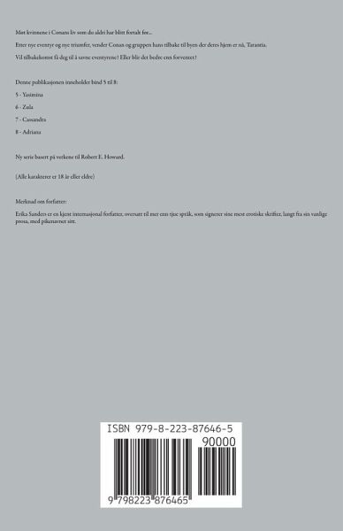 Møt kvinnene i Conans liv som du aldri har blitt fortalt før... Etter nye eventyr og nye triumfer, vender Conan og gruppen hans tilbake til byen der deres hjem er nå, Tarantia. Vil tilbakekomst få deg til å savne eventyrene? Eller blir det bedre enn forventet? Denne publikasjonen inneholder bind 5 til 8: 5 - Yasimina 6 - Zula 7 - Cassandra 8 - Adriana Ny serie basert på verkene til Robert E. Howard. (Alle karakterer er 18 år eller eldre) Merknad om forfatter: Erika Sanders er en kjent internasjonal forfatter, oversatt til mer enn tjue språk, som signerer sine mest erotiske skrifter, langt fra sin vanlige prosa, med pikenavnet sitt.